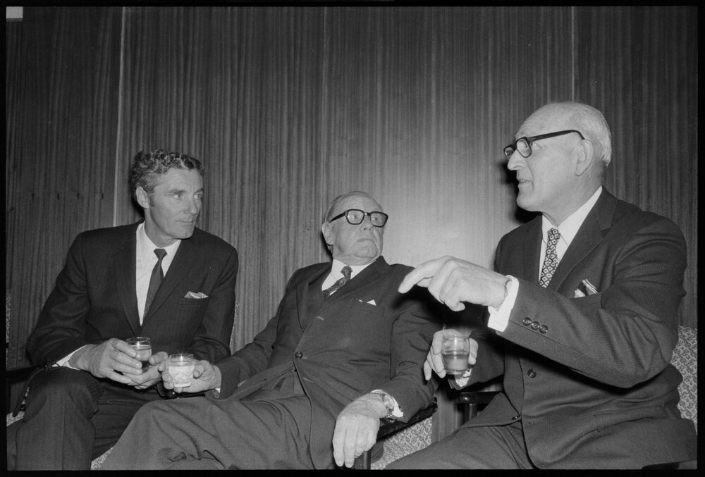 Date3 October 1973Reference NumberPhoto gcc-29900DescriptionEx-chairman honoured, deputy-chairman of the Tauranga Joint Generation Committee Mr L. D. Lees (right) emphasises a point to the chairman Mr A. Balfour (left) annd the honored guest of the evening, Mr W. J. Ross. Published 3 October 1973.FormatNegativePhysical Description35mm black-and-white negative (1/3)Photographer/CreatorBay of Plenty Times