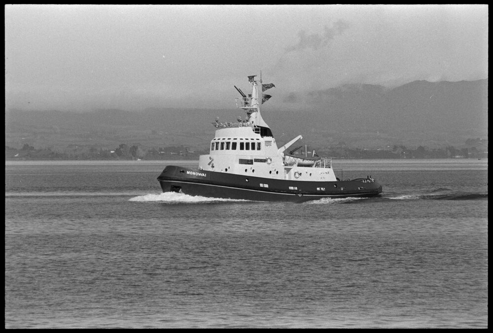 Date9 October 1973Reference NumberPhoto gcc-29922DescriptionSouthland Harbour Board's Tug boat 'Monowai' freshly painted, on her delivery voyage from Whangārei to Bluff, called at Mount Maunganui today. Not published 9 October 1973.FormatNegativePhysical Description35mm black-and-white negative (2/3)Photographer/CreatorBay of Plenty Times