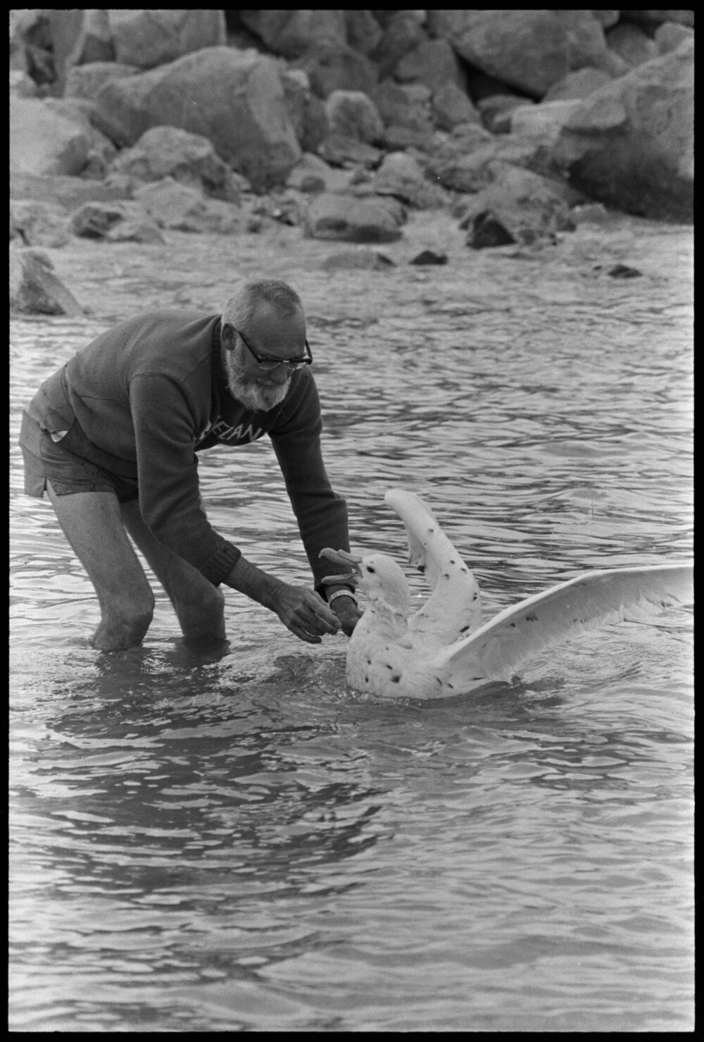 Date9 October 1973Reference NumberPhoto gcc-29925Description"Captain Tom" Allison, from Mount Maunganui Marineland, releasing the giant petrel yesterday afternoon. Not published 9 October 1973.FormatNegativePhysical Description35mm black-and-white negative (2/3)Photographer/CreatorBay of Plenty Times