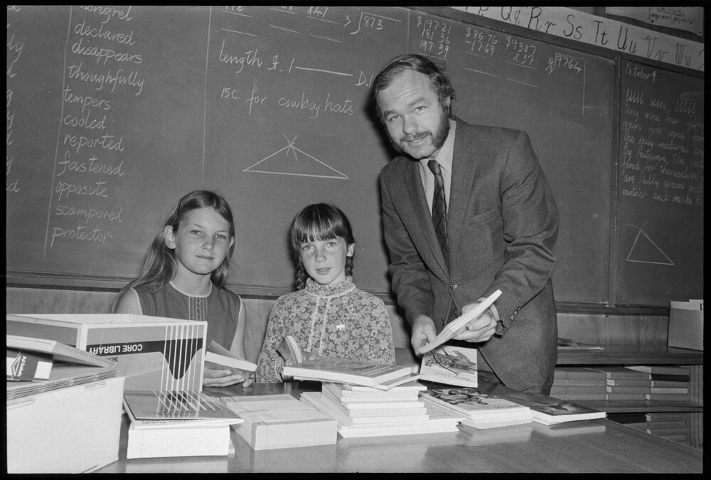 Date9 October 1973Reference NumberPhoto gcc-29928DescriptionBrand new books presented to Matua Primary School from Bay of Plenty Savings Bank. Linda Bell (left) and Diane Mathers both aged 11, with Mr J. M. Chappelle, manager of the Tauranga bank branch. Published 9 October 1973.FormatNegativePhysical Description35mm black-and-white negative (2/3)Photographer/CreatorBay of Plenty Times