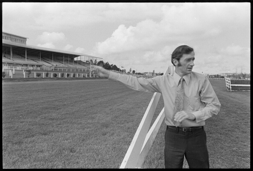 Date12 October 1973Reference NumberPhoto gcc-29976DescriptionThe secretary of the Bay of Plenty Racing Club Mr D. G. Hancock in front of the improved training track area, Tauranga Racecourse. Published 12 October 1973.FormatNegativePhysical Description35mm black-and-white negative (1/3)Photographer/CreatorBay of Plenty Times