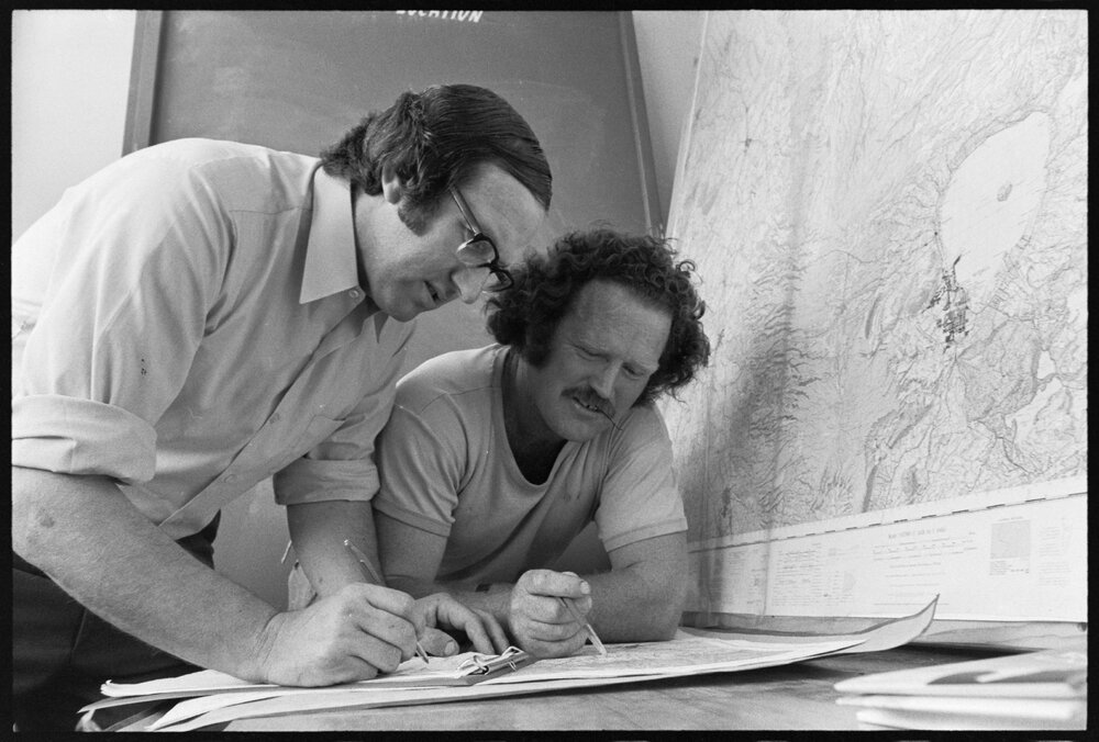 Date15 October 1973Reference NumberPhoto gcc-30008DescriptionMessrs Mills (left) and Humphries checking over a map of the Whakamārama area shortly before news came through that the missing hunter they were about to search for was safe. Published 15 October 1973.FormatNegativePhysical Description35mm black-and-white negative (1/3)Photographer/CreatorBay of Plenty Times