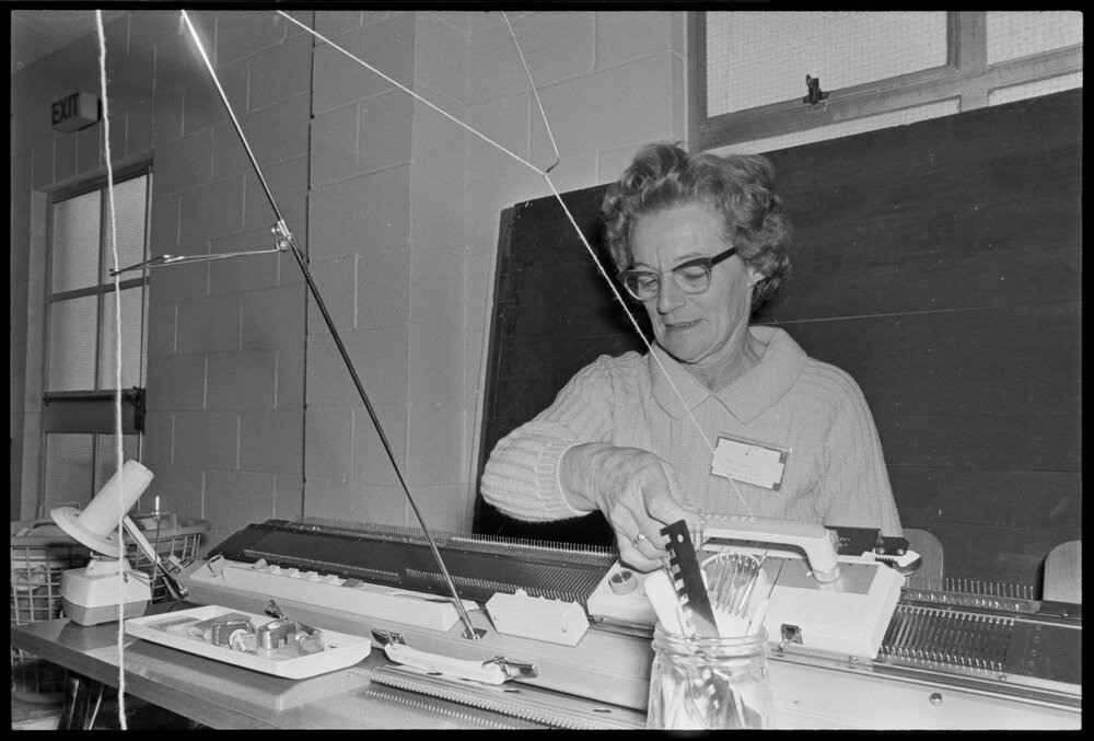 Date16 October 1973Reference NumberPhoto gcc-30025DescriptionKnit-in' by club. Tauranga Machine Knitting club held its first public "knit-in" today. Garments made on the machines by members were on display. Published 16 October 1973.FormatNegativePhysical Description35mm black-and-white negative (1/3)Photographer/CreatorBay of Plenty Times