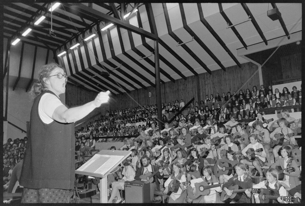 Date18 October 1973Reference NumberPhoto gcc-30056DescriptionMrs K. Wilson, from the Tauranga Intermediate School, conducts musicians from several local schools during a rehearsal for last night's Primary Schools Music Festival held in the Queen Elizabeth Youth Centre. Published 18 October 1973.FormatNegativePhysical Description35mm black-and-white negative (1/3)Photographer/CreatorBay of Plenty Times