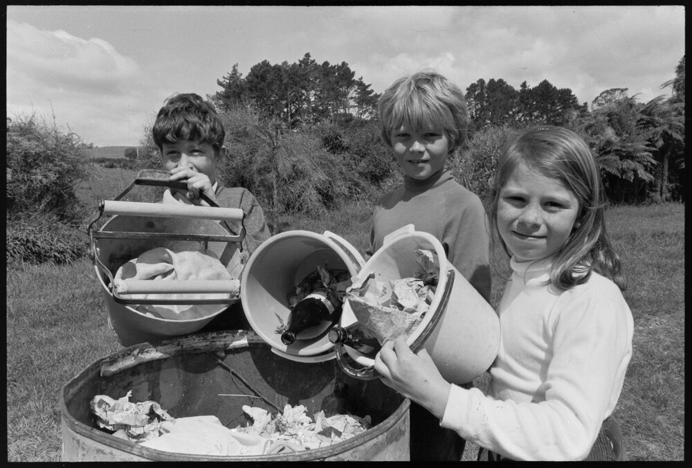 Date18 October 1973Reference NumberPhoto gcc-30062DescriptionWhakamārama students, from left to right, Brett Newton, aged 10, Tony Firth, aged 10 and Leona Dryer, aged eight, helping the national anti-litter campaign. Published 18 October 1973.FormatNegativePhysical Description35mm black-and-white negative (1/3)Photographer/CreatorBay of Plenty Times