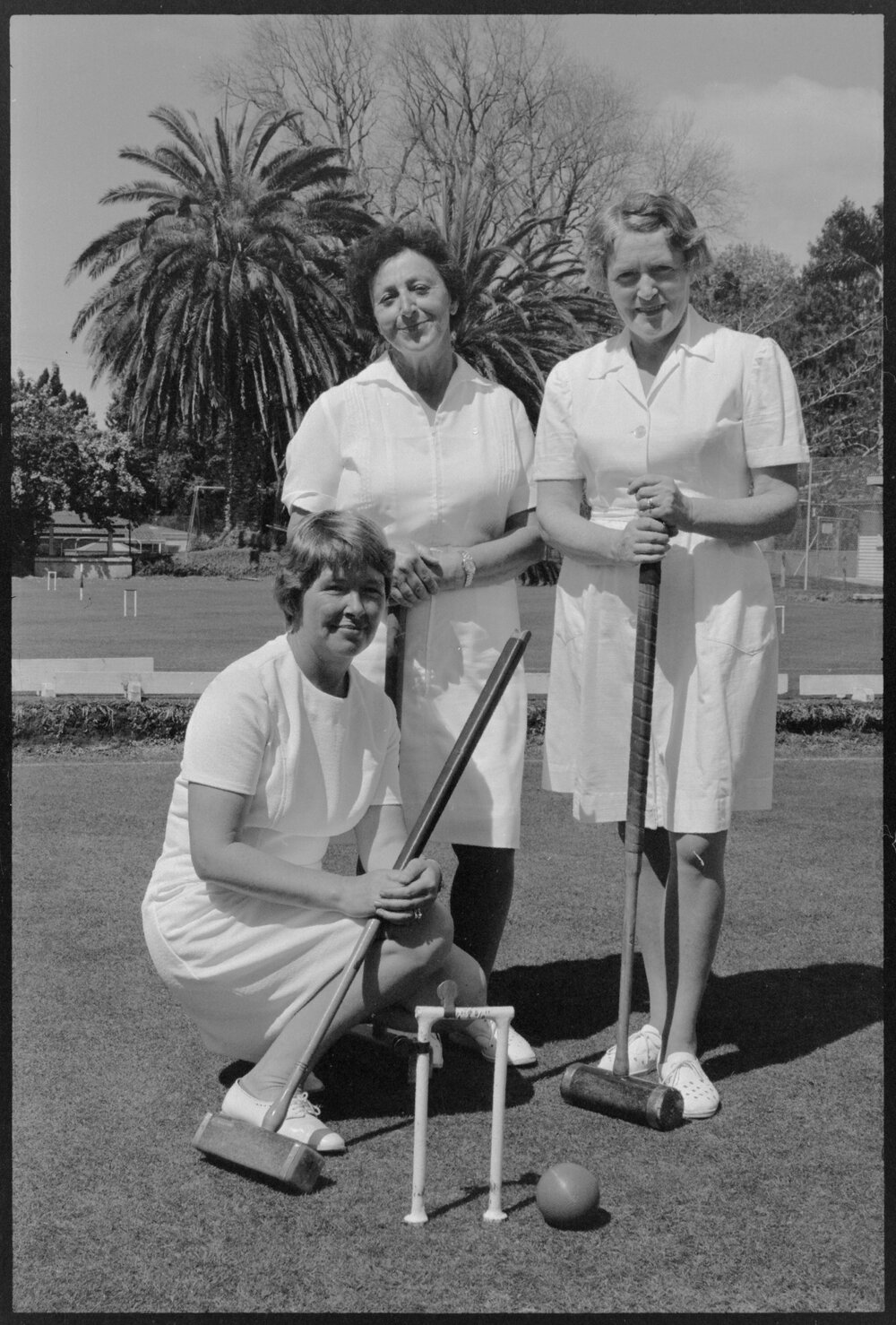 Date19 October 1973Reference NumberPhoto gcc-30074DescriptionBay of Plenty croquet respresentatives Dorothy Williams (kneeling), Larraine Sparling (centre) and Mrs June Marshall. Published 19 October 1973.FormatNegativePhysical Description35mm black-and-white negative (1/3)Photographer/CreatorBay of Plenty Times