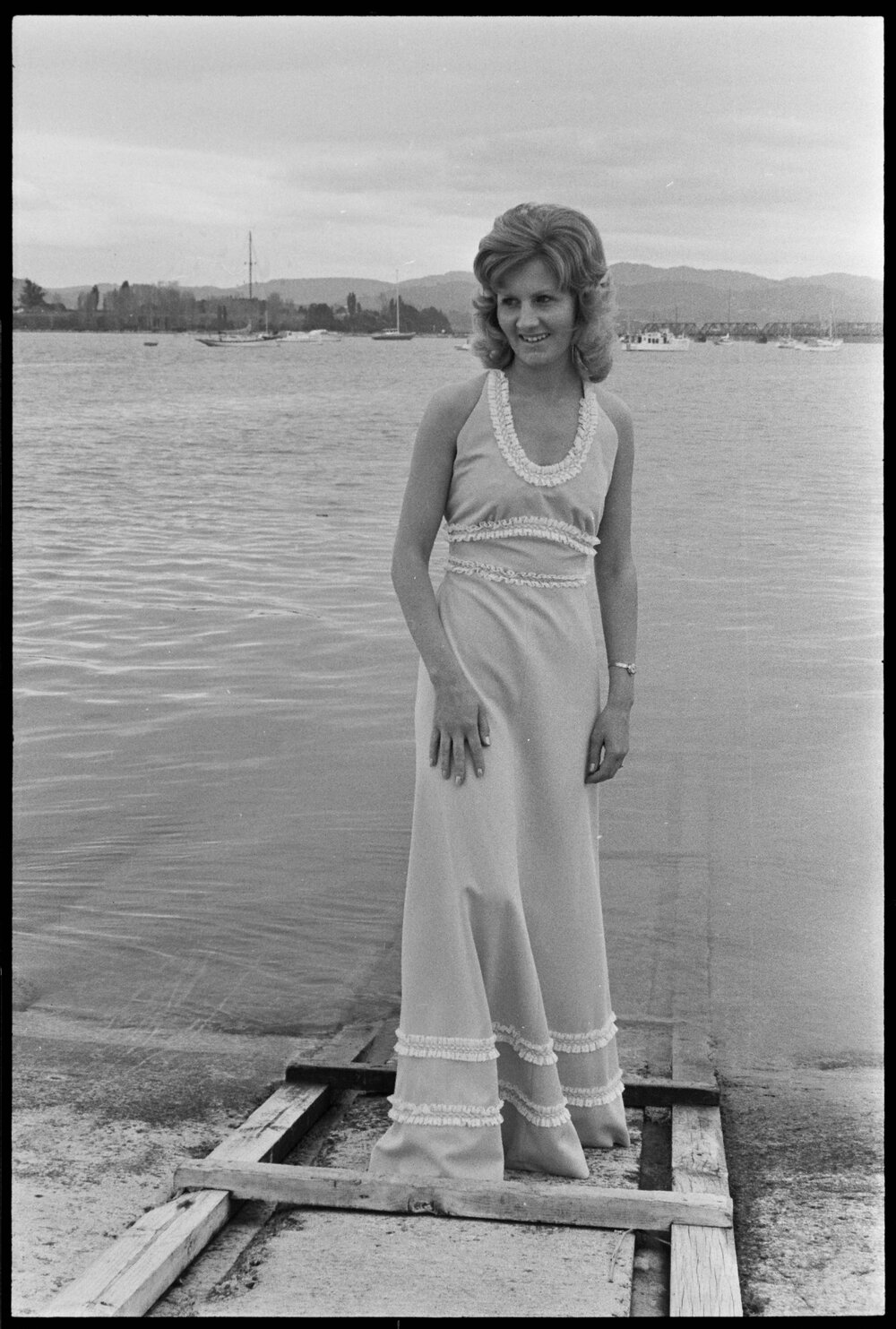 Date19 October 1973Reference NumberPhoto gcc-30083DescriptionModelling a pale blue halter-neck evening dress outside the Navy League headquarts in Tauranga is Mrs Judy Sharrock. Published 19 October 1973.FormatNegativePhysical Description35mm black-and-white negative (1/3)Photographer/CreatorBay of Plenty Times