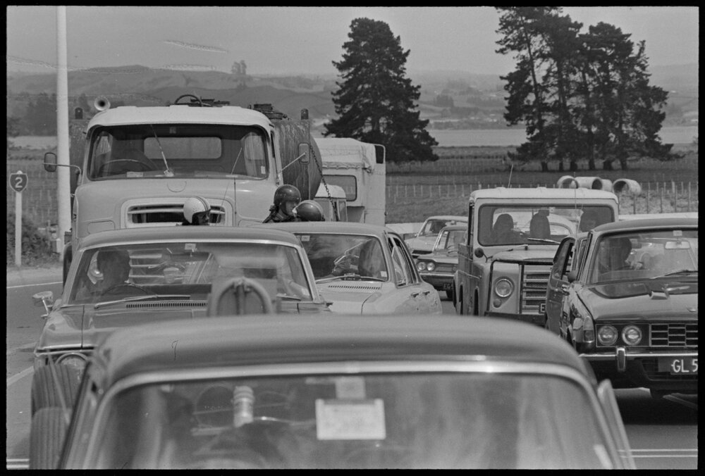 Date23 October 1973Reference NumberPhoto gcc-30107DescriptionRailway shunting holding up Labour Weekend traffic on State Highway 2. Published 23 October 1973.FormatNegativePhysical Description35mm black-and-white negative (2/3)Photographer/CreatorBay of Plenty Times