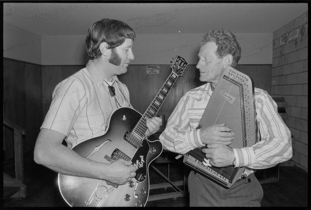 Date23 October 1973Reference NumberPhoto gcc-30118DescriptionTuning their instruments during the second annual country music convention in Tauranga is Jim Coyle (left) president of the NZ Country Music Association, and the chairman, Charlie Brickland. Published 23 October 1973.FormatNegativePhysical Description35mm black-and-white negative (1/3)Photographer/CreatorBay of Plenty Times