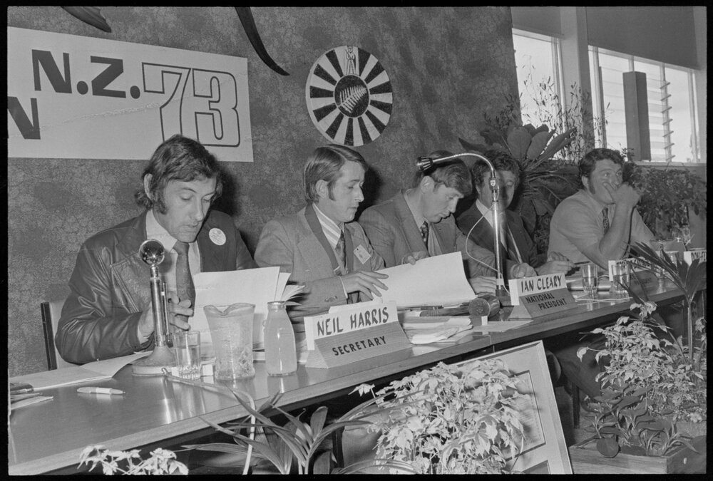 Date23 October 1973Reference NumberPhoto gcc-30125DescriptionRound Table convention, Round Table convention, Executive members of the Round Table movement during a business session at the national convention held in Tauranga over Labour weekend. From left, Messrs Neil Harris, the secretary, Ian Cleary, the president and Trevor Savage, the vice-president.. Published 23 October 1973.FormatNegativePhysical Description35mm black-and-white negative (2/3)Photographer/CreatorBay of Plenty Times