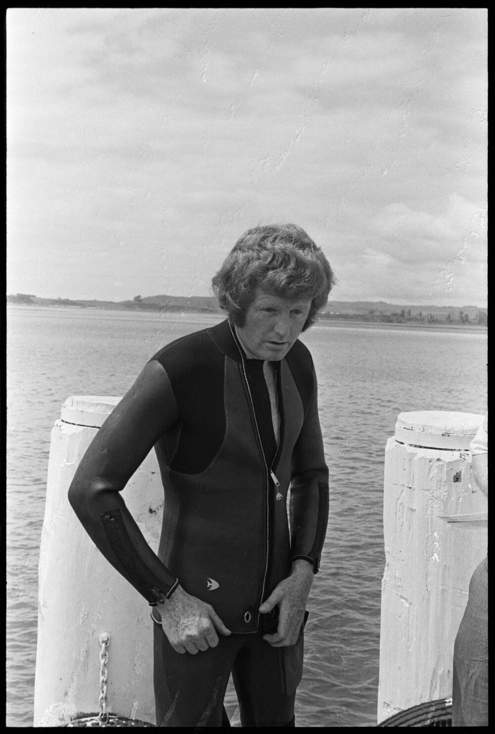 Date24 October 1973Reference NumberPhoto gcc-30140DescriptionThe Hellephone is a portable telephoe allowing divers to communicate underwater, here it's being demonstrated at Bay of Plenty Harbour Board's Sulphur Point slipway. Not published 24 October 1973.FormatNegativePhysical Description35mm black-and-white negative (3/4)Photographer/CreatorBay of Plenty Times