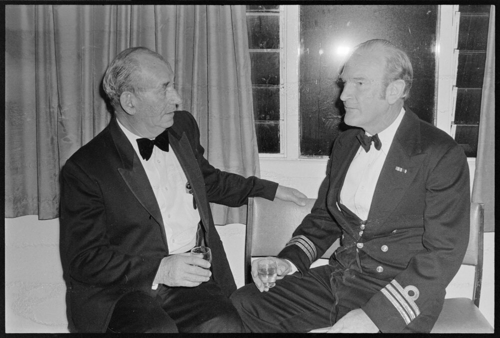 Date25 October 1973Reference NumberPhoto gcc-30148DescriptionMr T. R. P. Crawford and Commander C. H. Hall RNZN, of Auckland, guest speaker at the annual Trafalgar Day Dinner in Tauranga. Published 25 October 1973.FormatNegativePhysical Description35mm black-and-white negative (1/3)Photographer/CreatorBay of Plenty Times