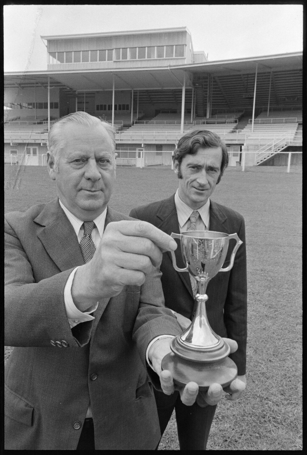 Date25 October 1973Reference NumberPhoto gcc-30154DescriptionMr Bay of Plenty Racing Club president, Mr R Silson, and Mr D. G. Hancock with the Bay of Plenty Gold Cup. Published 25 October 1973.FormatNegativePhysical Description35mm black-and-white negative (1/3)Photographer/CreatorBay of Plenty Times