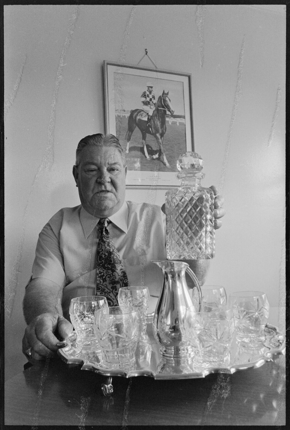 Date25 October 1973Reference NumberPhoto gcc-30157DescriptionMr Bill Carter who owned Blue Beard, winner of the 1963 Bay of Plenty Cup, he is displaying the wine decanter and glasses which went with the winner's prize. Published 25 October 1973.FormatNegativePhysical Description35mm black-and-white negative (1/3)Photographer/CreatorBay of Plenty Times