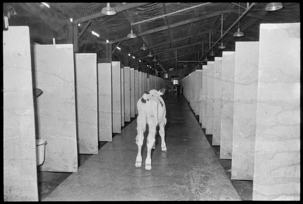 Date27 October 1973Reference NumberPhoto gcc-30185DescriptionLone calf walking about in the feeding kennels. Not published 27 October 1973.FormatNegativePhysical Description35mm black-and-white negative (3/3)Photographer/CreatorBay of Plenty Times