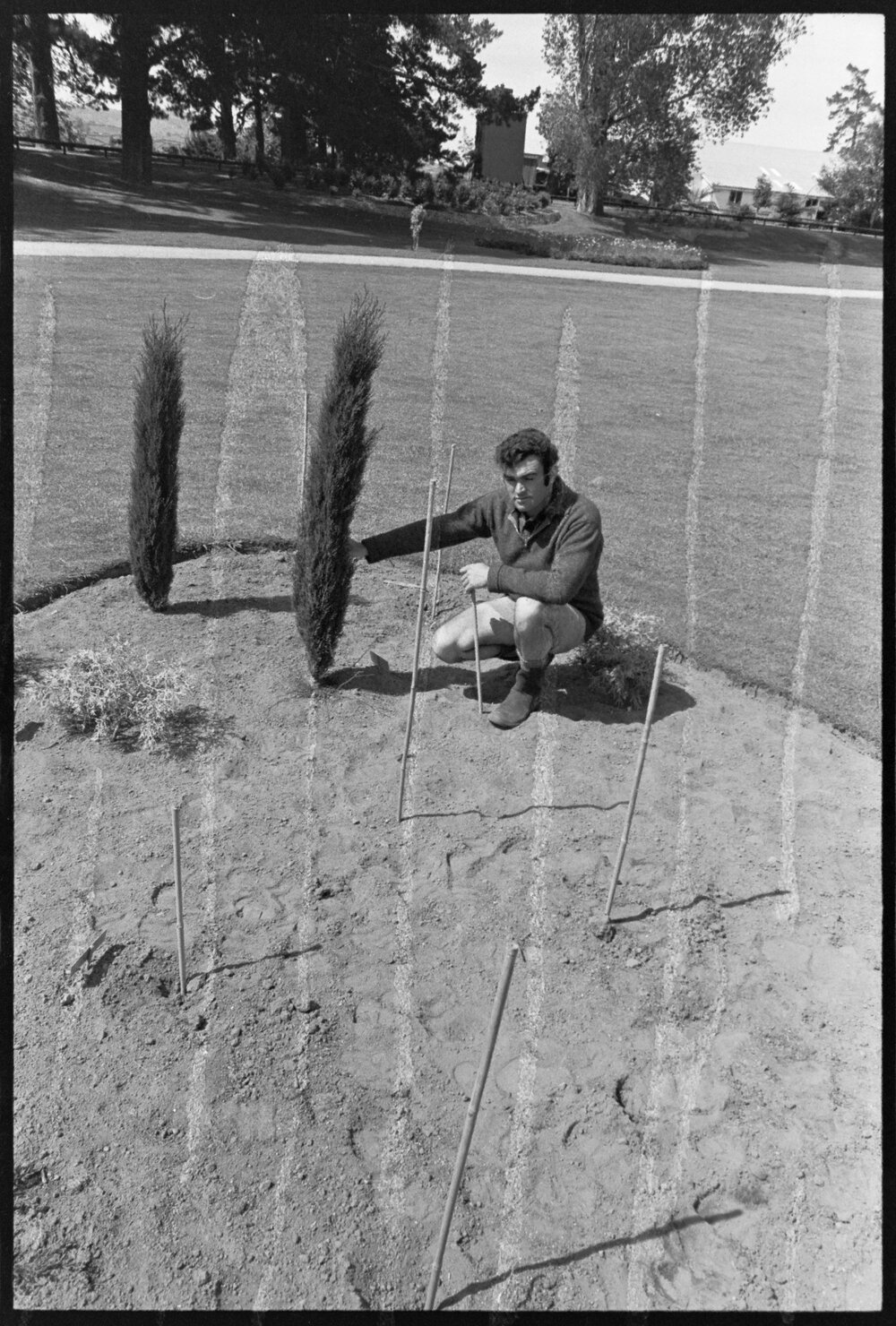 Date29 October 1973Reference NumberPhoto gcc-30187|Photo gcc-30188||DescriptionMr T. Kennedy holding stakes which mark the spot where dwarf conifer plants were torn out during the night. Published 29 October 1973.FormatNegativePhysical Description35mm black-and-white negative (1/3)Photographer/CreatorBay of Plenty Times