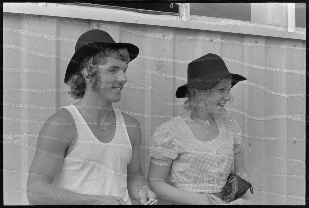 Date29 October 1973Reference NumberPhoto gcc-30195DescriptionRace day fashions, Kevin Barry of Auckland and Bev Crawford of Te Aroha. Not published 29 October 1973.FormatNegativePhysical Description35mm black-and-white negative (1/4)Photographer/CreatorBay of Plenty Times