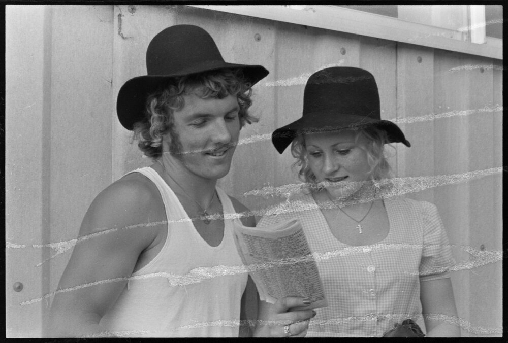 Date29 October 1973Reference NumberPhoto gcc-30199DescriptionRace day fashions, Kevin Barry of Auckland and Bev Crawford of Te Aroha. Not published 29 October 1973.FormatNegativePhysical Description35mm black-and-white negative (1/3)Photographer/CreatorBay of Plenty Times