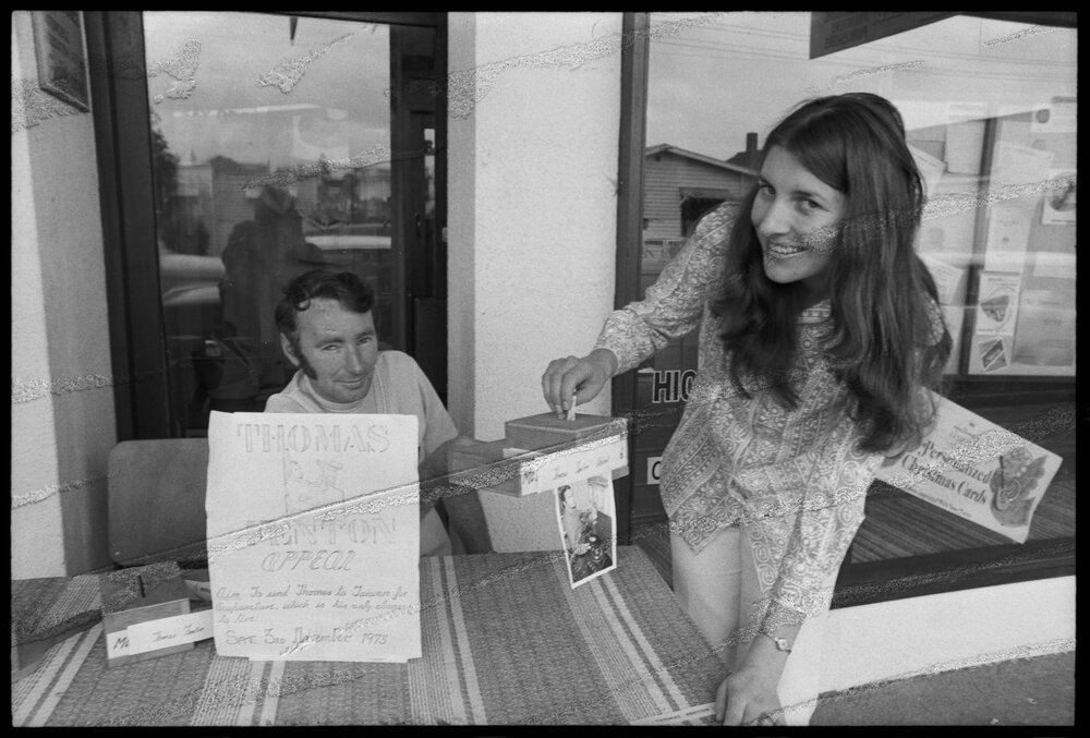 Date3 November 1973Reference NumberPhoto gcc-30245DescriptionMrs E. Hands of Tauranga shopping and helping raise funds for Mr Thomas Fenton, who has muscular distrophy, travel to Taiwan for accupunctuure treatment. Published 3 November 1973.FormatNegativePhysical Description35mm black-and-white negative (1/3)Photographer/CreatorBay of Plenty Times
