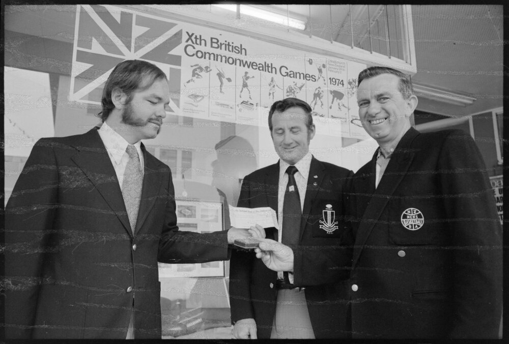Date5 November 1973Reference NumberPhoto gcc-30273DescriptionMr J. N. Chappell, Tauranga branch manager for Bay of Plenty Savings Bank with a $300 cheque he received on behalf of an appeal to raise funds for the Commonwealth Games. The cheque was handed over by Mr N. Pope (centre) and Mr R. Towers (right) holding a sample of the all-weather track to be used at the Games.Published 5 November 1973.FormatNegativePhysical Description35mm black-and-white negative (1/3)Photographer/CreatorBay of Plenty Times