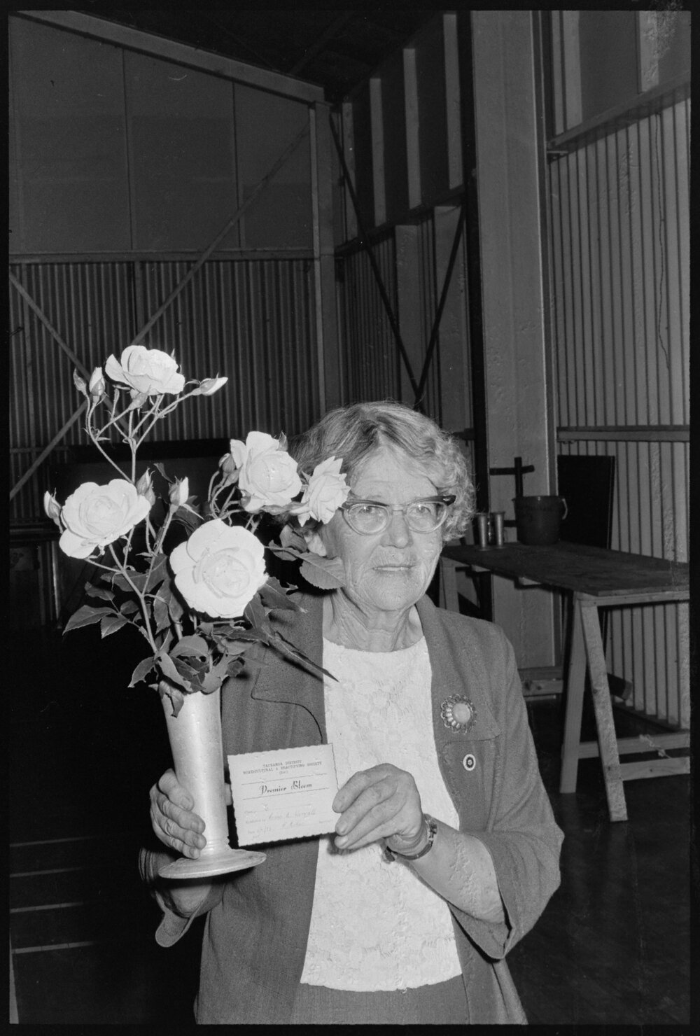Date7 November 1973Reference NumberPhoto gcc-30288DescriptionMiss M. Worrall of Tauranga holds her prize winning arrangement of five decorative stems of floribunda in the novice section at the Festival of Roses. Published 7 November 1973.FormatNegativePhysical Description35mm black-and-white negative (1/3)Photographer/CreatorBay of Plenty Times