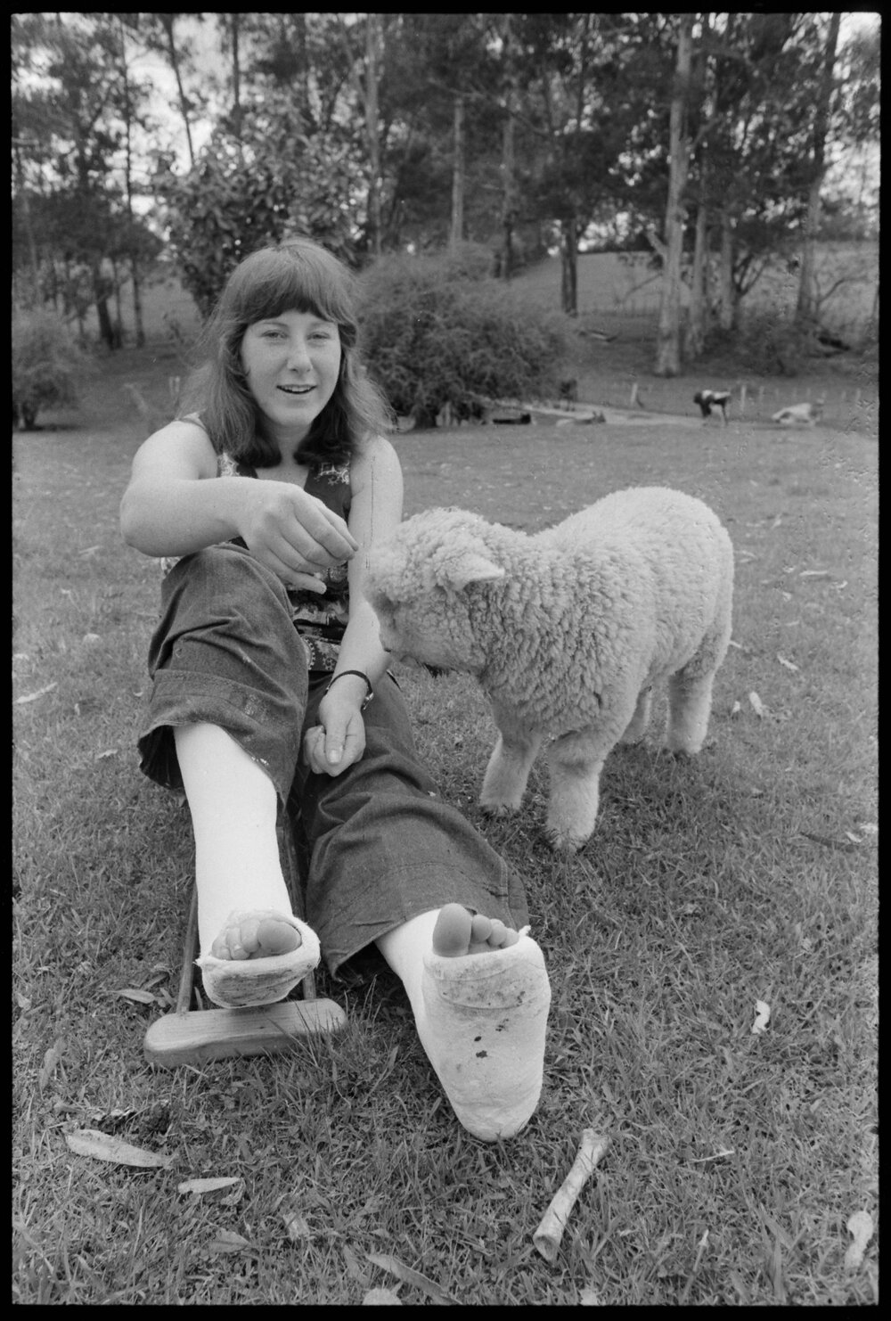 Date8 November 1973Reference NumberPhoto gcc-30294DescriptionJackie the lamb provides a bit of fun for Jenny Baker, pictured with her plaster encased legs at her parents farm south of Te Puke. Published 8 November 1973.FormatNegativePhysical Description35mm black-and-white negative (1/3)Photographer/CreatorBay of Plenty Times