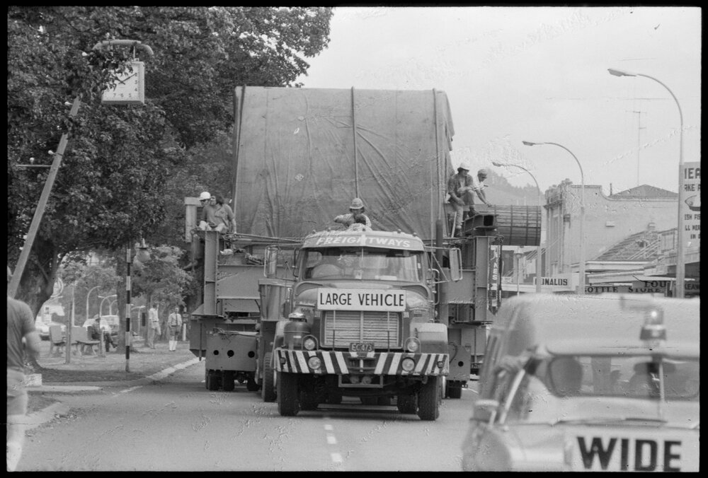 Date8 November 1973Reference NumberPhoto gcc-30303DescriptionThe 18ft, 116-ton drying cylinder for the No. 3 paper machine at the Caxton Mills, Kawerau slowly being transported through the township of Te Puke. Published 8 November 1973.FormatNegativePhysical Description35mm black-and-white negativePhotographer/CreatorBay of Plenty Times
