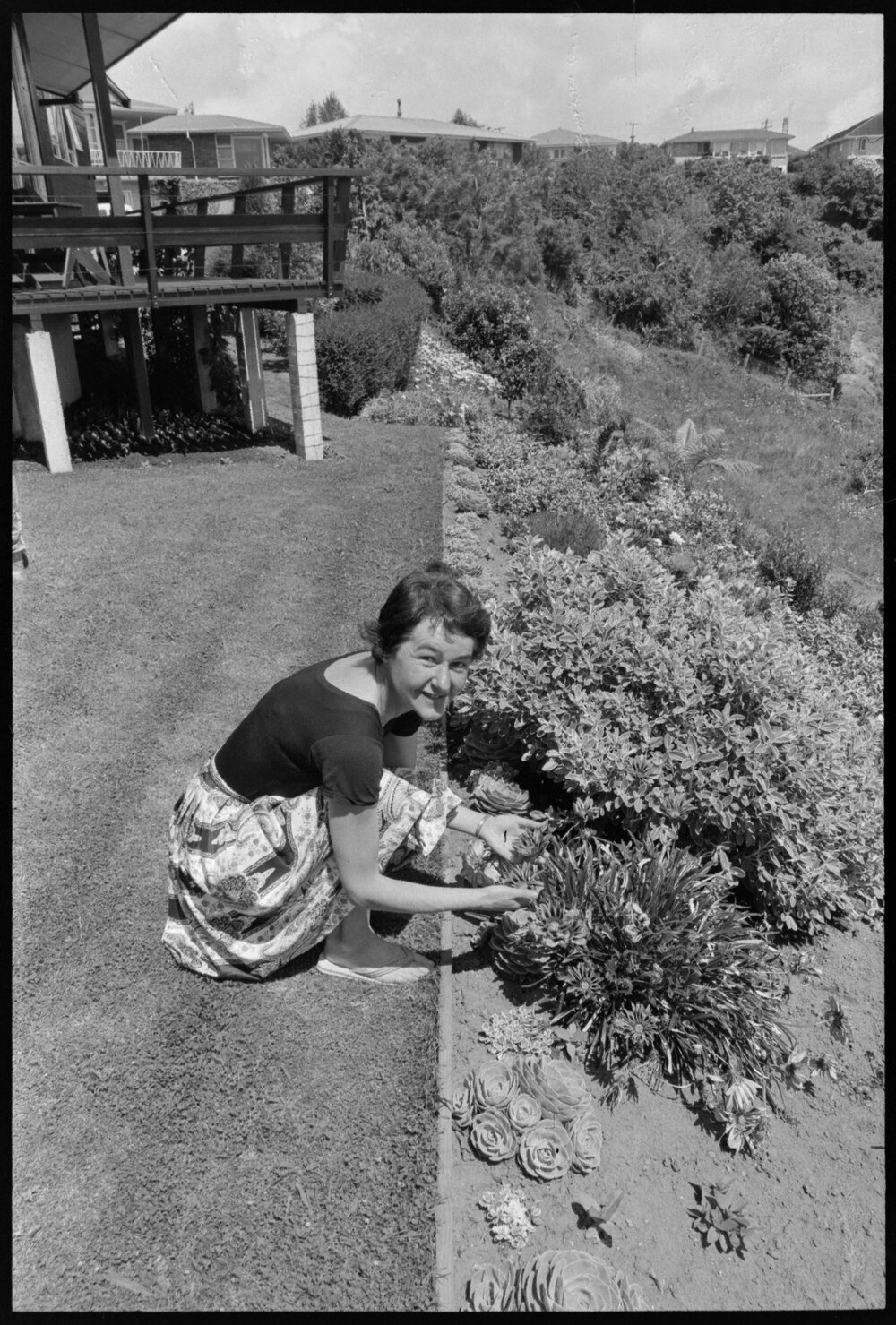 Date6 November 1973Reference NumberPhoto gcc-30348DescriptionMrs K. E. Berntsson of Milton Road, Ōtūmoetai, working in her and her husband's garden which won the private garden, not over three years old section, of the Garden of the Year competition. Published 6 November 1973.FormatNegativePhysical Description35mm black-and-white negative (2/3)Photographer/CreatorBay of Plenty Times