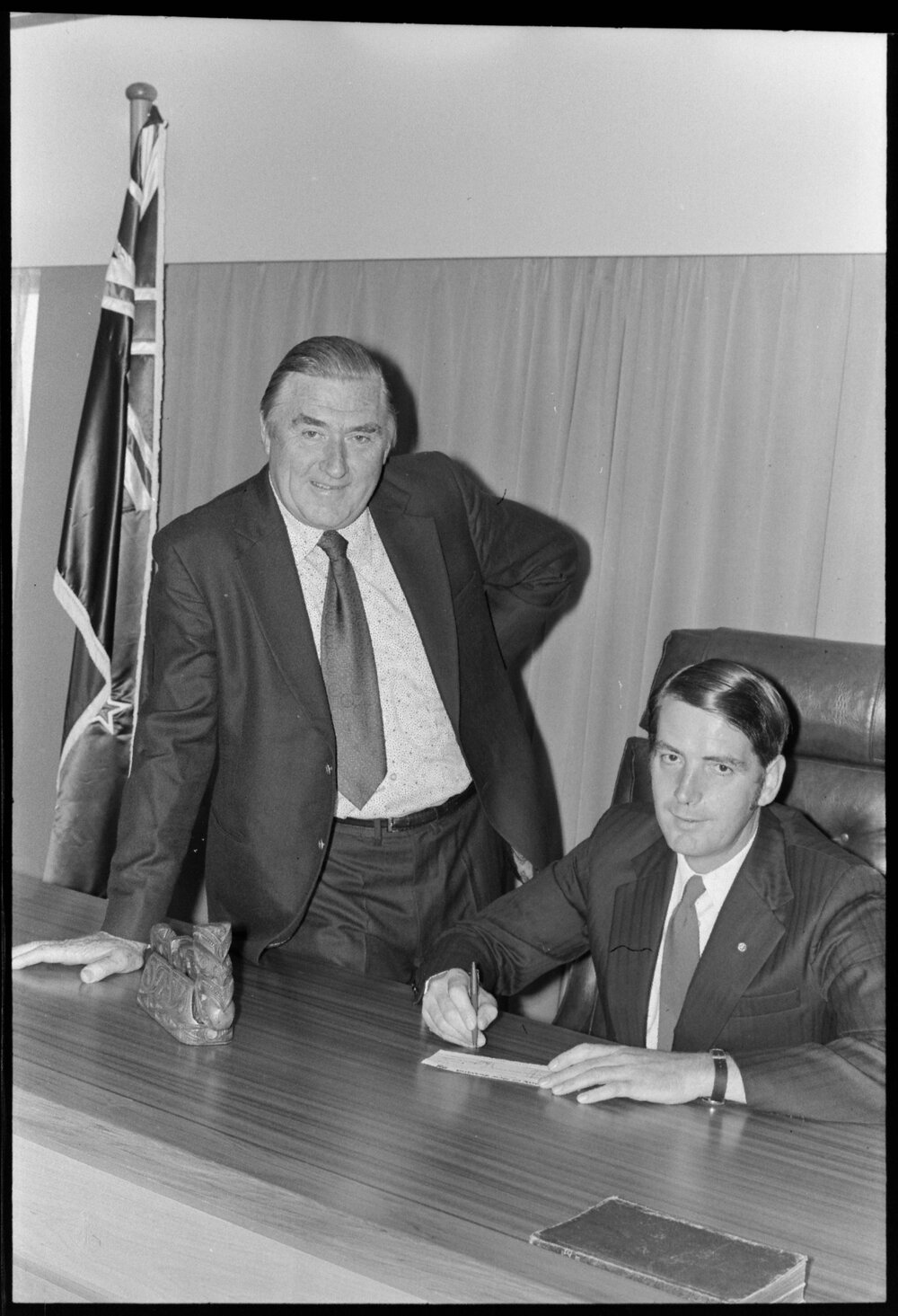 Date13 November 1973Reference NumberPhoto gcc-30366DescriptionMr R. J. Edmonds (rigth) Tauranga manager of the Bank of New Zealand, signs the $9600 cheque before handing the loan over to Mr R. A. Owens, the Mayor of Tauranga. Published 13 November 1973.FormatNegativePhysical Description35mm black-and-white negative (1/2)Photographer/CreatorBay of Plenty Times