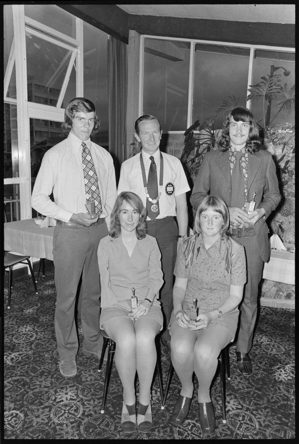 Date13 November 1973Reference NumberPhoto gcc-30371DescriptionWinners of the Ōtūmoetai Rotary Club's 1973 youth achievement awards, pictured with the club president, Mr J. H. Tutbury (centre) are (standing, from left) Peter Rowbotham, Roger Peak (seated, from left) Veronica Frost and Jenny Glenn. Published 13 November 1973.FormatNegativePhysical Description35mm black-and-white negative (1/3)Photographer/CreatorBay of Plenty Times