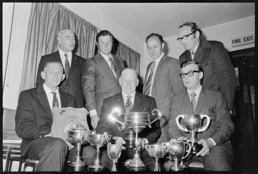 Date13 November 1973Reference NumberPhoto gcc-30374DescriptionLong service medals for bandsmen, Members of the City of Tauranga Highland Pipe Band who have been presented with long service medals are pictured right with challenge trophies won by the band. They are (back row, from left) Messrs J. G. Corston, C. Thomas, W. R. Humphrys, G W. Fairbairn, T. H. Allely, A. O. Lloyd and L. F. Cameron. Published 13 November 1973.FormatNegativePhysical Description35mm black-and-white negative (1/3)Photographer/CreatorBay of Plenty Times