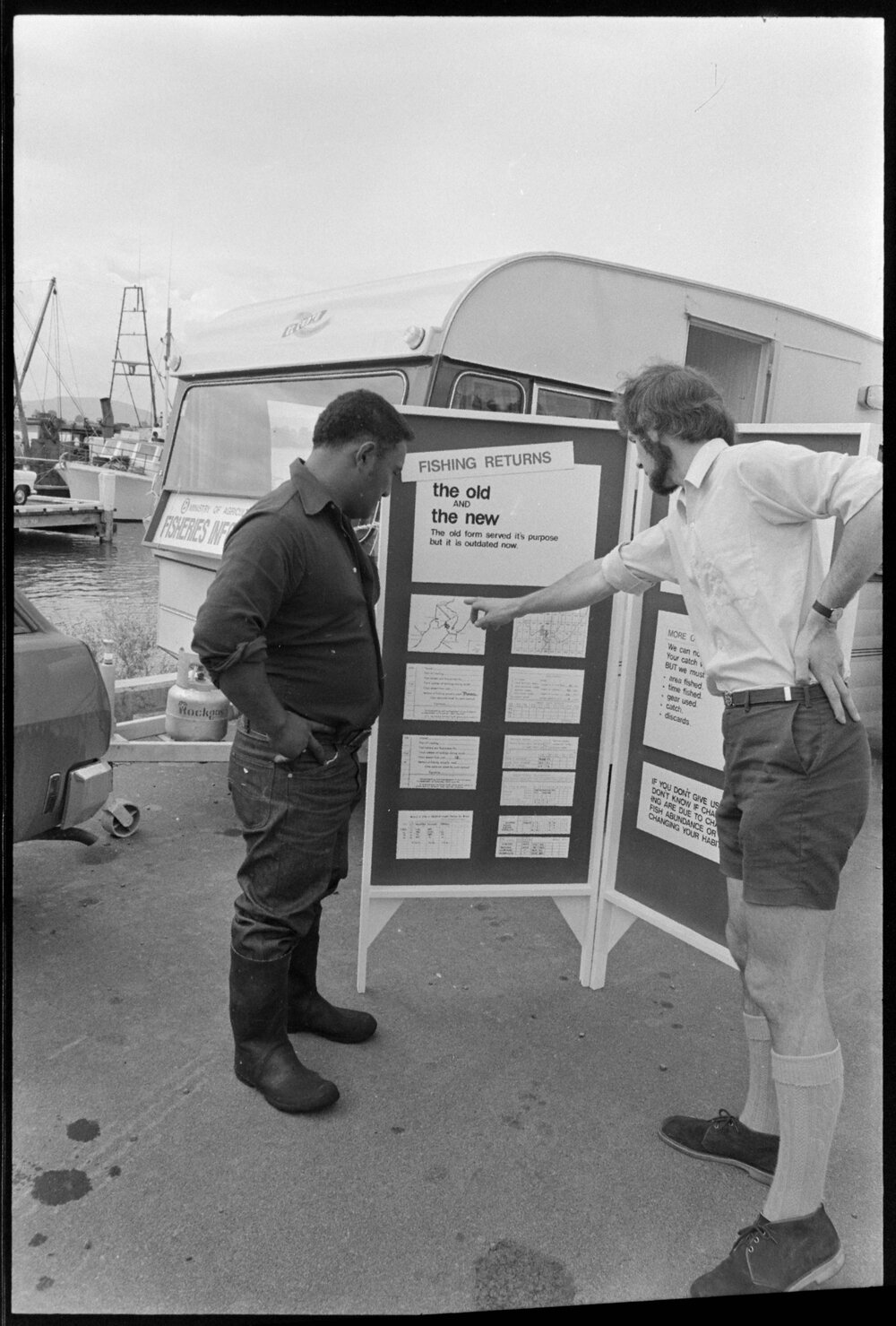 Date15 November 1973Reference NumberPhoto gcc-30407DescriptionMr J. A. Colman (right) of the Fisheries Research Division of the Ministry of Agriculture and Fisheries compares the old and new fishing returns systems to Tauranga fisherman Mr R. Rolleston. Published 15 November 1973.FormatNegativePhysical Description35mm black-and-white negative (1/5)Photographer/CreatorBay of Plenty Times