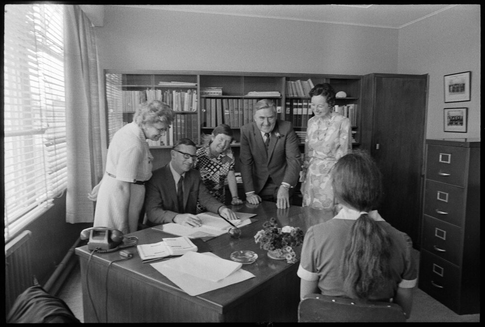 Date15 November 1973Reference NumberPhoto gcc-30429DescriptionScreening one of the applicants for the scholarships yesterday is the special committee comprising of (from left) Mrs Drayton, Mr Bongard (chairman), Miss Bruce, Mr Owens and Miss Boyd. Published 15 November 1973.FormatNegativePhysical Description35mm black-and-white negative (1/5)Photographer/CreatorBay of Plenty Times