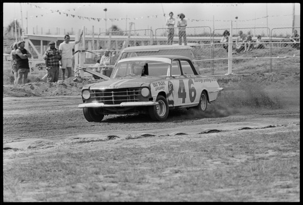 Date16 November 1973Reference NumberPhoto gcc-30442DescriptionBay Park stock and saloon car season soon to begin in November, with local drivers trying out their 2.2 Cresta-powered saloons on the re-formed dirt circuit. Published 16 November 1973.FormatNegativePhysical Description35mm black-and-white negative (1/3)Photographer/CreatorBay of Plenty Times