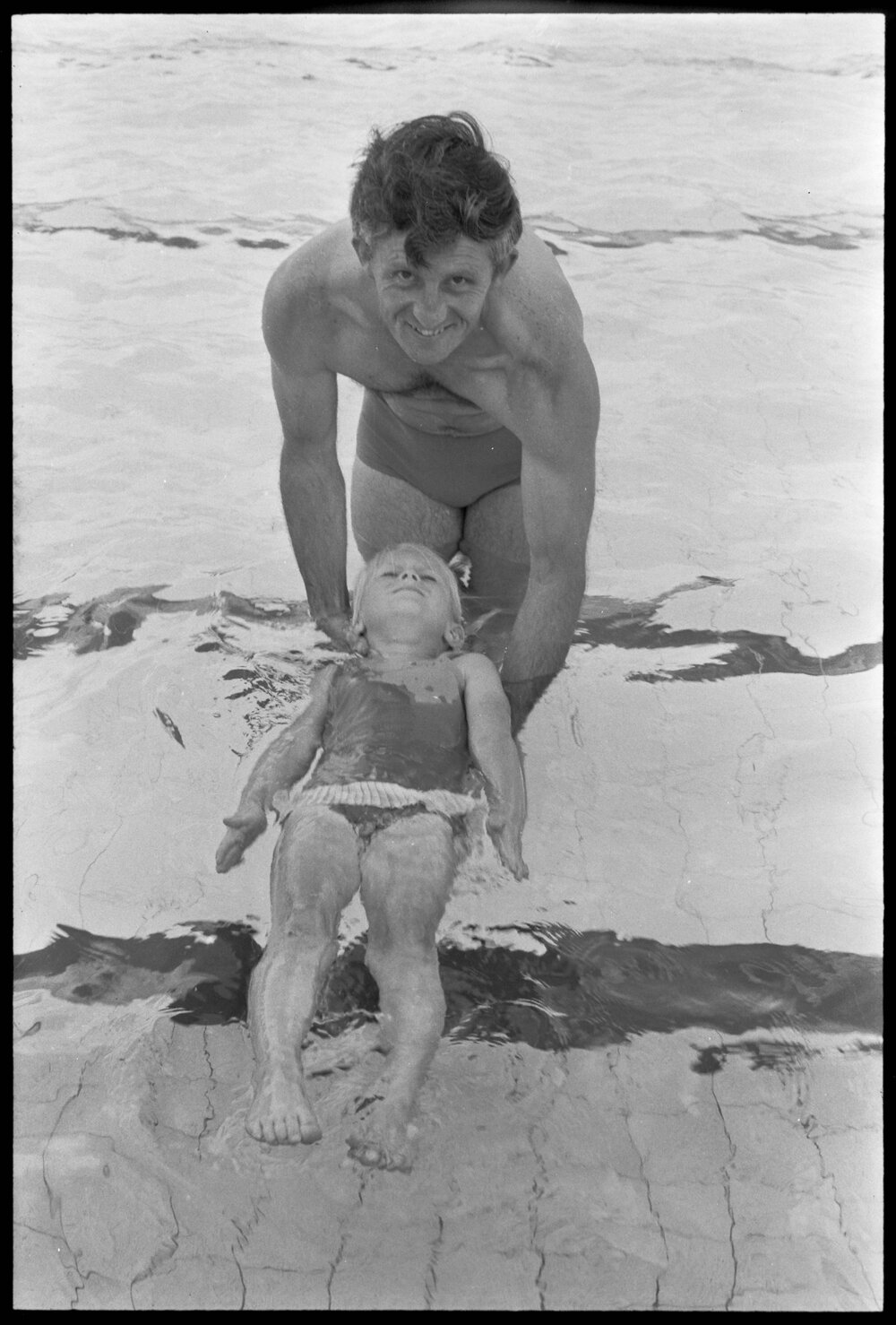 Date16 November 1973Reference NumberPhoto gcc-30473DescriptionBridget Howard learns the essential art of floating on her back, assisted by coach Baron Fanicevic. Published 16 November 1973.FormatNegativePhysical Description35mm black-and-white negative (1/3)Photographer/CreatorBay of Plenty Times