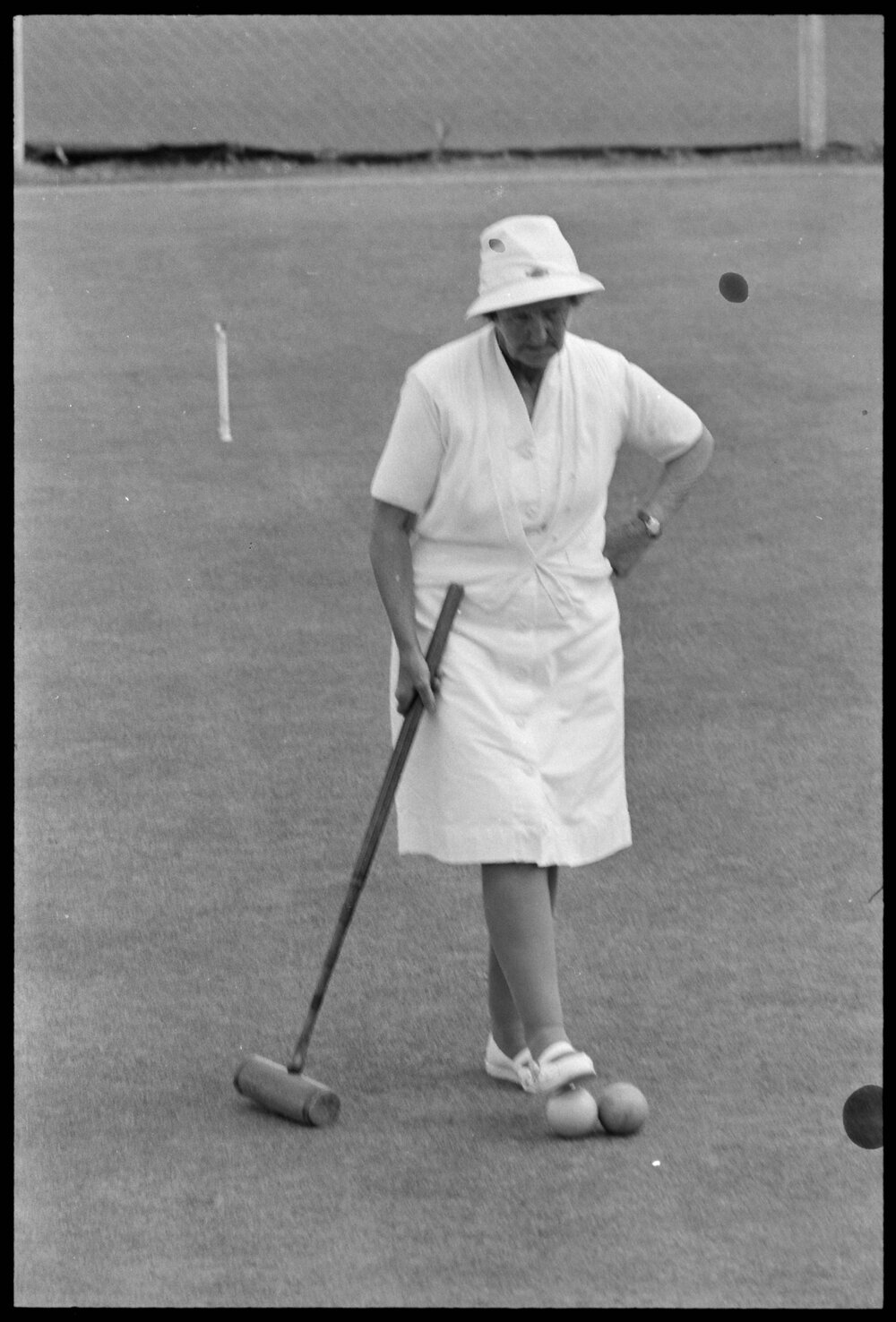 Date17 November 1973Reference NumberPhoto gcc-30507DescriptionMrs R. J. Sparling of Mount Maunganui completes a shot during the senior doubles at the Tauranga Croquet Club's open annual tournament at the Domain. Not published 17 November 1973.FormatNegativePhysical Description35mm black-and-white negative (4/8)Photographer/CreatorBay of Plenty Times