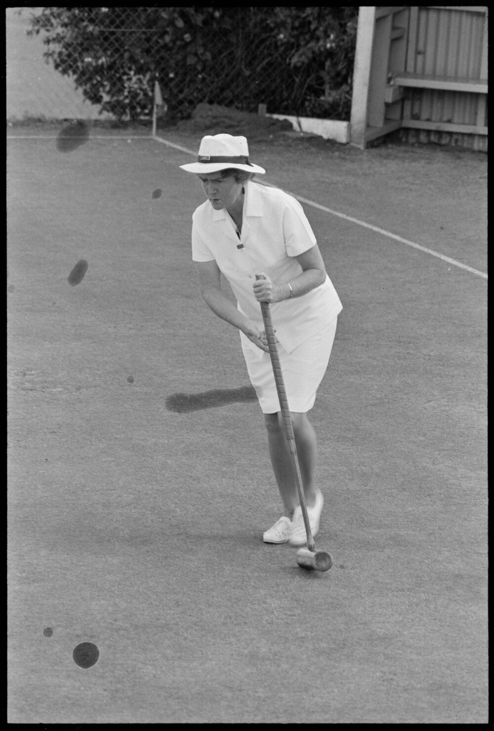 Date17 November 1973Reference NumberPhoto gcc-30509DescriptionMrs R. J. Sparling of Mount Maunganui completes a shot during the senior doubles at the Tauranga Croquet Club's open annual tournament at the Domain. Not published 17 November 1973.FormatNegativePhysical Description35mm black-and-white negative (6/8)Photographer/CreatorBay of Plenty Times