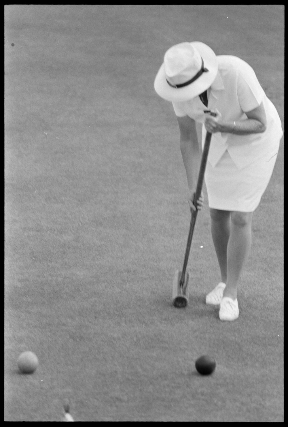 Date17 November 1973Reference NumberPhoto gcc-30510DescriptionMrs R. J. Sparling of Mount Maunganui completes a shot during the senior doubles at the Tauranga Croquet Club's open annual tournament at the Domain. Not published 17 November 1973.FormatNegativePhysical Description35mm black-and-white negative (7/8)Photographer/CreatorBay of Plenty Times