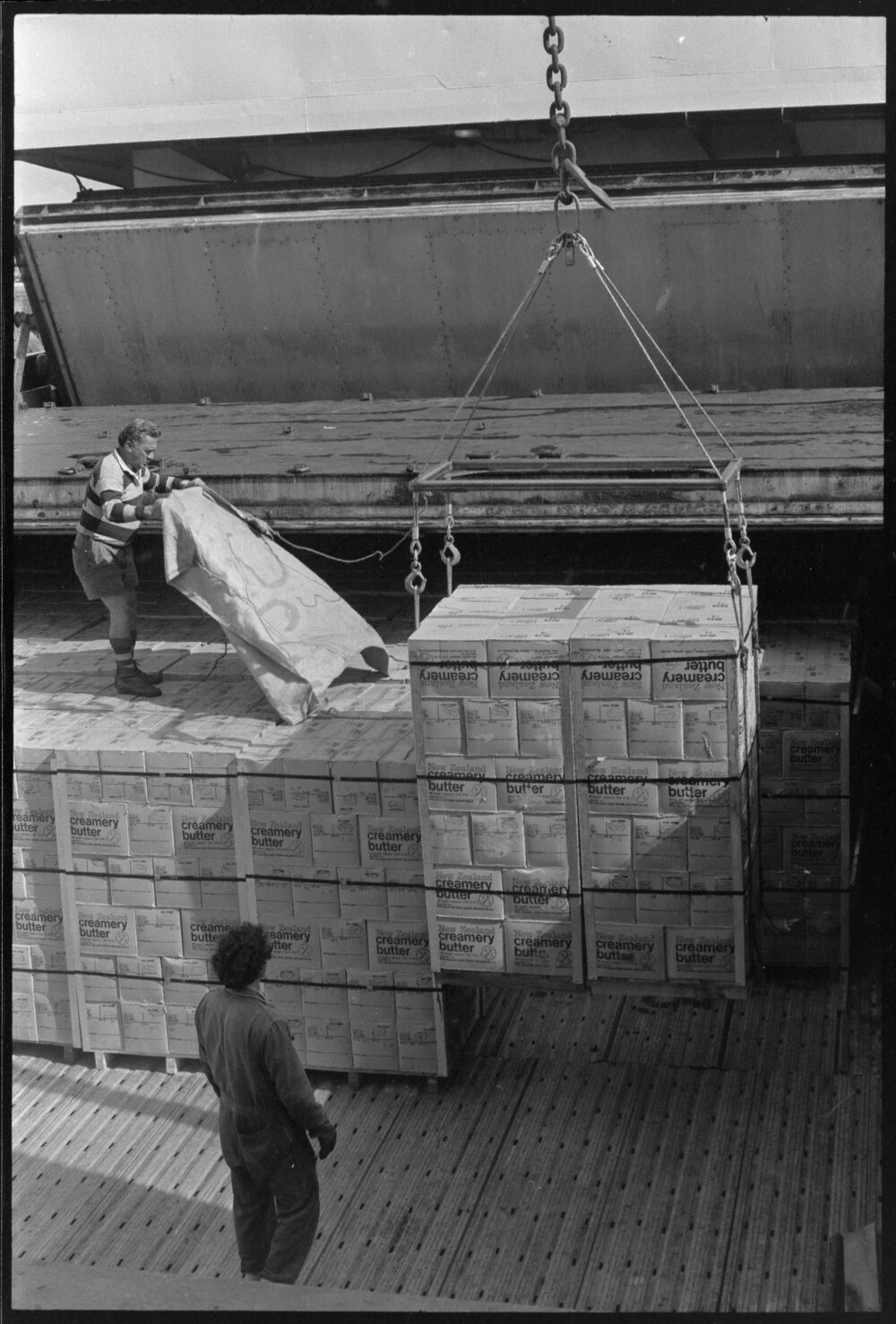 Date19 November 1973Reference NumberPhoto gcc-30515DescriptionExperimental unit loads of butter going aboard the Mayfield. Published 19 November 1973.FormatNegativePhysical Description35mm black-and-white negative (1/4)Photographer/CreatorBay of Plenty Times