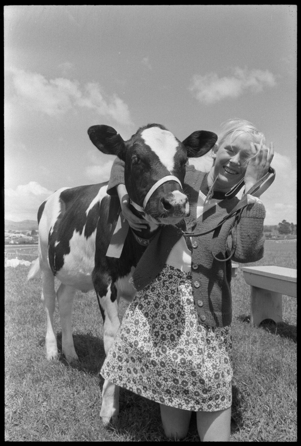 Date21 November 1973Reference NumberPhoto gcc-30543DescriptionNgaire Sheely's five-month Friesian calf Diamond at the Tauranga Boys and Girls Agricultural Day at the Tauranga Racecourse, the pair represented the Ōmokoroa No. 1 School. Published 21 November 1973.FormatNegativePhysical Description35mm black-and-white negative (1/3)Photographer/CreatorBay of Plenty Times