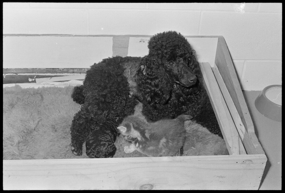 Date24 November 1973Reference NumberPhoto gcc-30579DescriptionSamantha the poodle with George the five week-old kitten. Published 24 November 1973.FormatNegativePhysical Description35mm black-and-white negative (1/5)Photographer/CreatorBay of Plenty Times