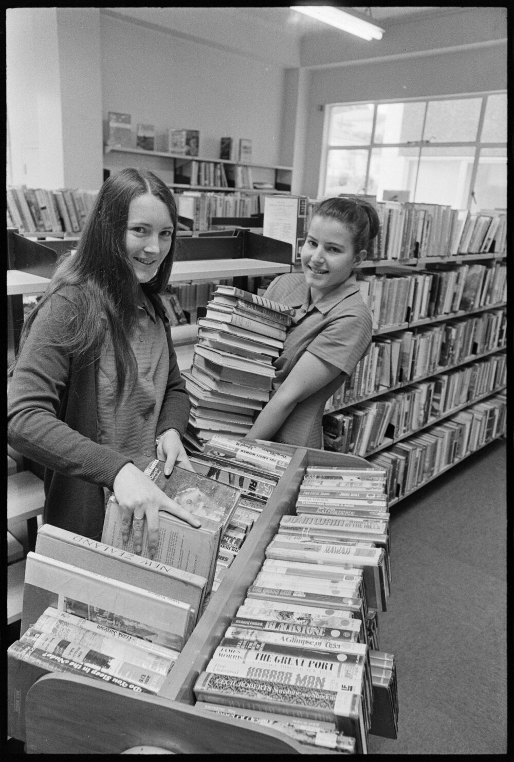 Date24 November 1973Reference NumberPhoto gcc-30590DescriptionMiss D. Wilson (left) and Miss J. Kelly, assistant librarians at the Tauranga Public Library, transferring books to the new wing yesterday. Published 24 November 1973.FormatNegativePhysical Description35mm black-and-white negative (1/3)Photographer/CreatorBay of Plenty Times