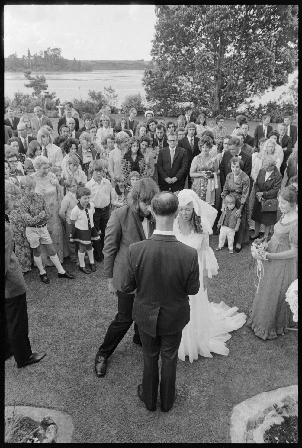 Date19 November 1973Reference NumberPhoto gcc-30599DescriptionOutdoor wedding of Janet Plummer and Bruce Cross in Ōmokoroa. Published 19 November 1973.FormatNegativePhysical Description35mm black-and-white negative (1/6)Photographer/CreatorBay of Plenty Times