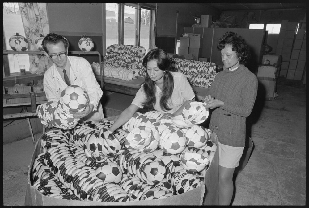 Date27 November 1973Reference NumberPhoto gcc-30613DescriptionFactory manager, Mr R. J. Buckle of the Pasgaard factory, sprays a soccer ball before distribution to a retail outlet. Not Published 27 November 1973.FormatNegativePhysical Description35mm black-and-white negative (3/5)Photographer/CreatorBay of Plenty Times