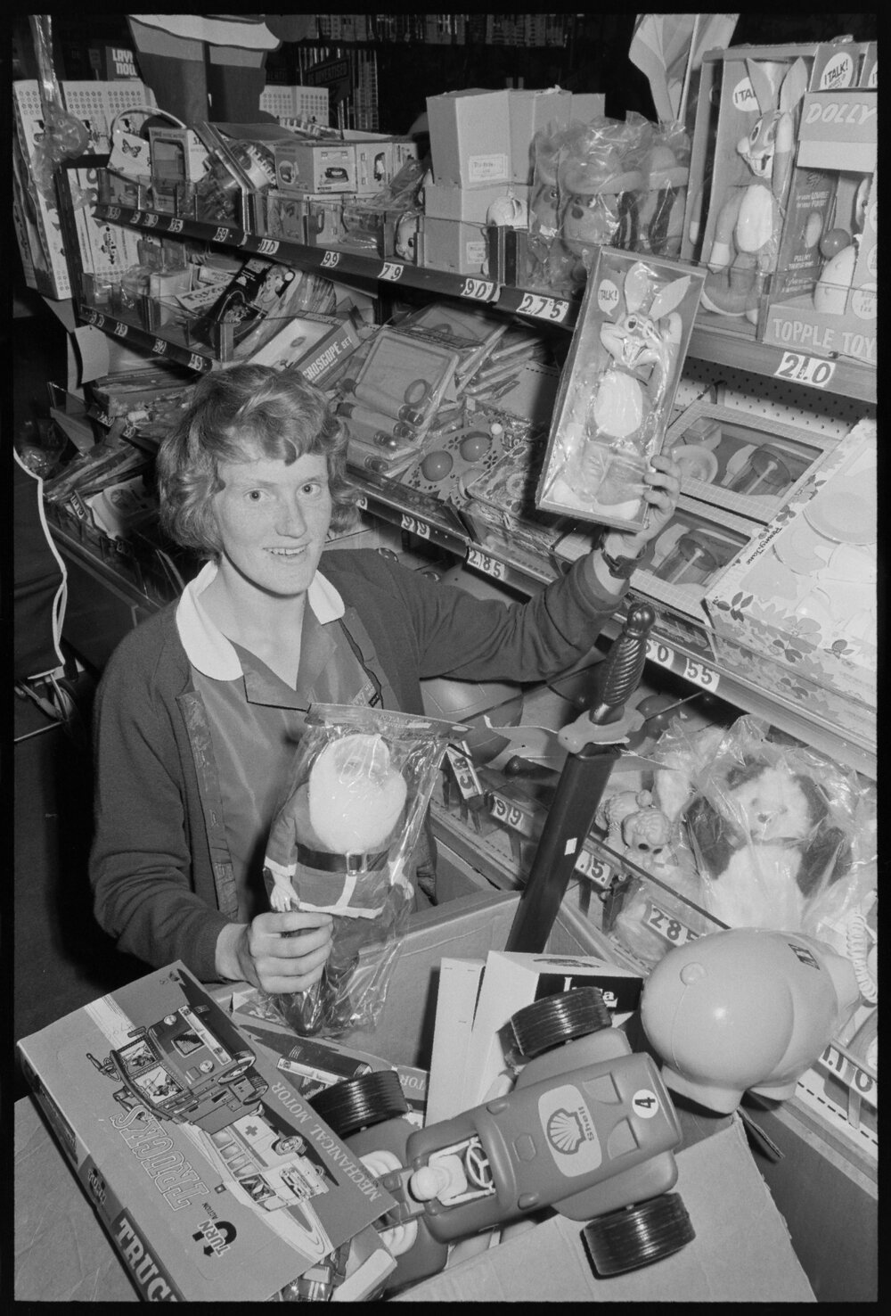 Date27 November 1973Reference NumberPhoto gcc-30616DescriptionMiss Christine Mapp, a Tauranga downtown department store assistant is surrounded by stock as she replenishes supplies. Published 27 November 1973.FormatNegativePhysical Description35mm black-and-white negative (1/2)Photographer/CreatorBay of Plenty Times
