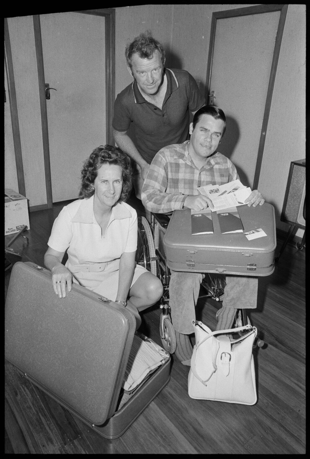 Date30 November 1973Reference NumberPhoto gcc-30677DescriptionTom Fenton sets out for Taiwan with his parents Mr and Mrs Bloxham for treatment to his muscular dystrophy condition.Published 30 November 1973.FormatNegativePhysical Description35mm black-and-white negative (1/3)Photographer/CreatorBay of Plenty Times