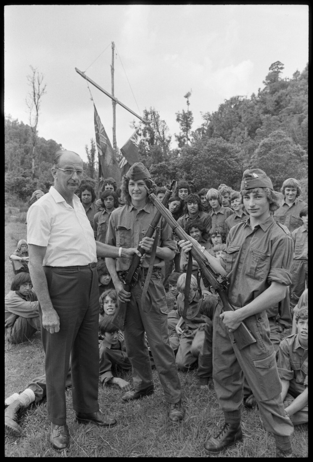 Date30 November 1973Reference NumberPhoto gcc-30681DescriptionMr H. M. Stephens (left) treasurer of Tauranga RSA branch presents the branch's gift of two .303 match competition riflesto Brian Hartley and Richard Wade, who received them on behalf of Tauranga Boys College at the cadet school. Published 30 November 1973.FormatNegativePhysical Description35mm black-and-white negative (2/3)Photographer/CreatorBay of Plenty Times