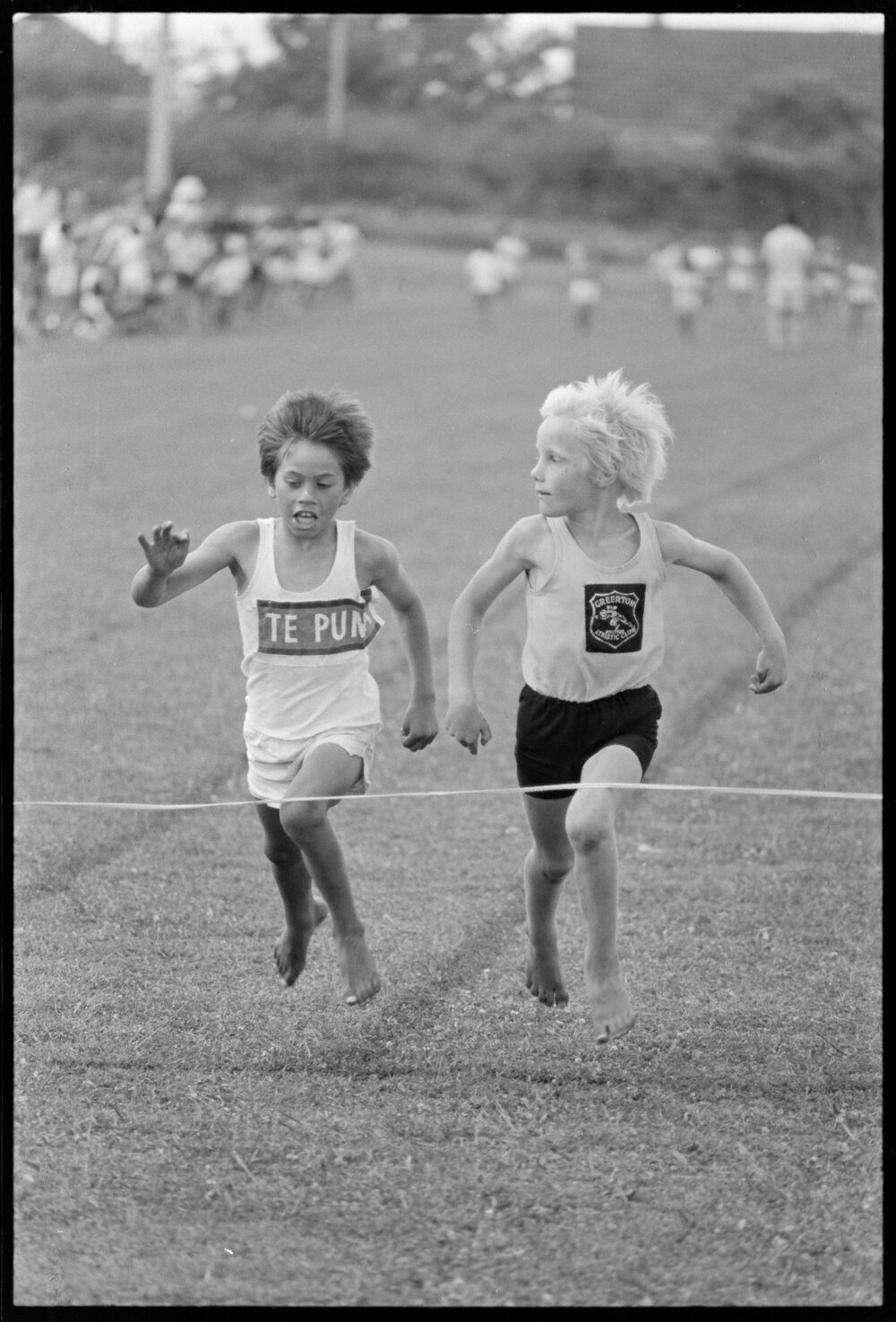 Date3 December 1973Reference NumberPhoto gcc-30713DescriptionTe Puke Athletics, young competitors are six-year-old boys from left, N. Bidois from the Te Puna club and B. Breing of Greerton Club at the Jennings Cup athletics meet. Published December 1973.FormatNegativePhysical Description35mm black-and-white negative (2/3)Photographer/CreatorBay of Plenty Times