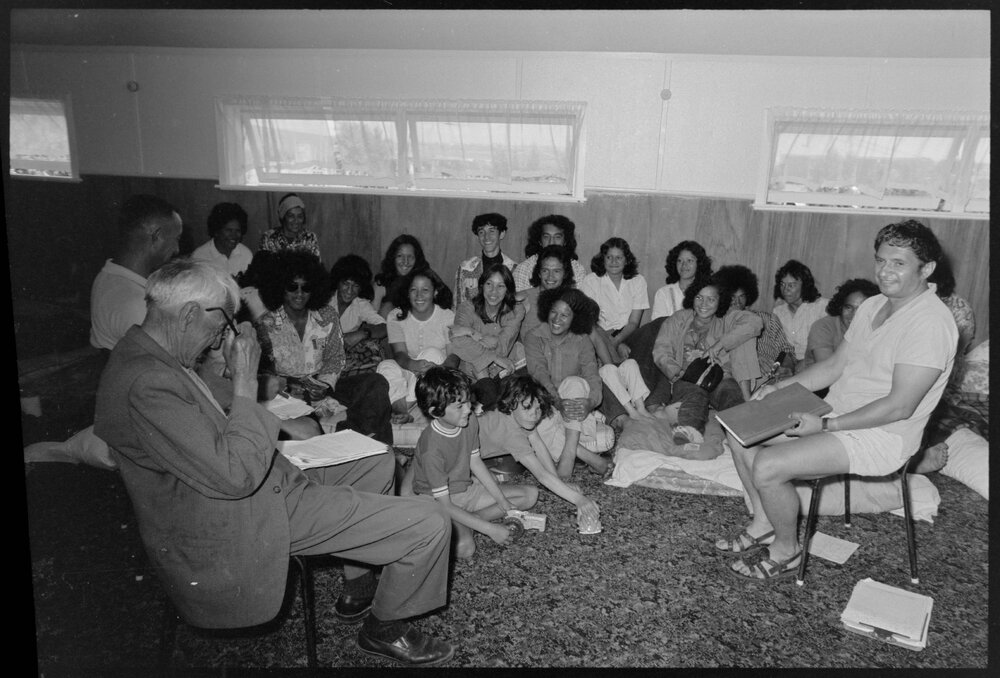 Date8 December 1973Reference NumberPhoto gcc-30720DescriptionSeminar held in Tamapahore marae, Mangatawa for Mount Maunganui College Māori Club and members parents over a three-day long stay, hosted by Messrs Ohia, T. Te Kani, and Mr J. Barrett (far right). Published 8 December 1973.FormatNegativePhysical Description35mm black-and-white negative (3/6)Photographer/CreatorBay of Plenty Times
