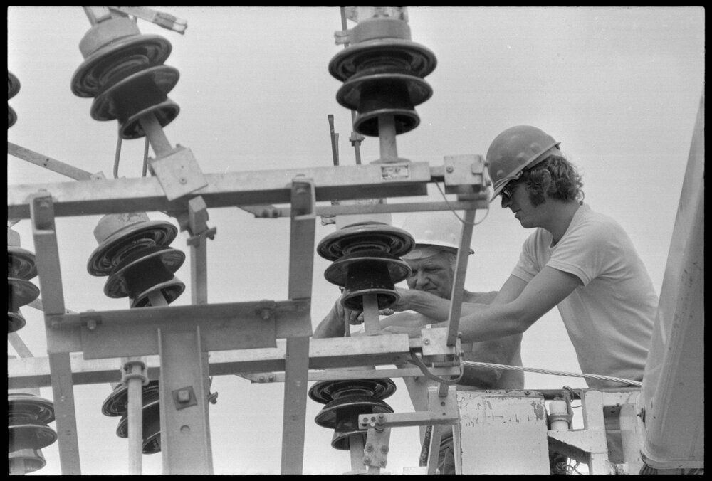 Date4 December 1973Reference NumberPhoto gcc-30733DescriptionLinesman and electrical fitter working at the new switching station at Greerton. Published 4 December 1973.FormatNegativePhysical Description35mm black-and-white negative (1/3)Photographer/CreatorBay of Plenty Times